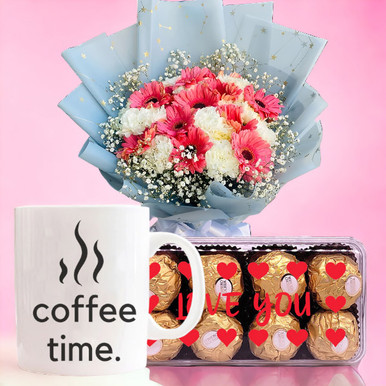 Teddy with Personalised Mug & Gourmet Chocolates in Heart Box: A charming gift set featuring a cuddly teddy, custom mug, and exquisite heart-shaped gourmet chocolates, perfect for expressing love and affection. Order now online and fast delivery at your preferred location. Same day delivery inside Kathmandu and 3-5 days outside Kathmandu valley.
